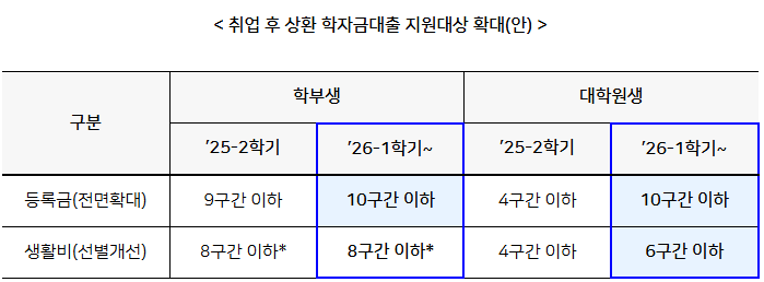 교육부는 재학 중 상환 부담없이 학업에 전념할 수 있도록 2026학년도부터 취업 후 상환 학자금대출 지원 대상을 대폭 확대한다. 취업 후 상환 대출 중 등록금 대출은 소득요건 제한을 폐지하여, 모든 대학생과 대학원생이 취업 후 상환 학자금 등록금 대출을 신청할 수 있다. 생활비 대출은 학자금 지원 8구간 이하 대학생, 학자금 지원 6구간 이하 대학원생의 안정적인 생활과 학업을 지원한다.